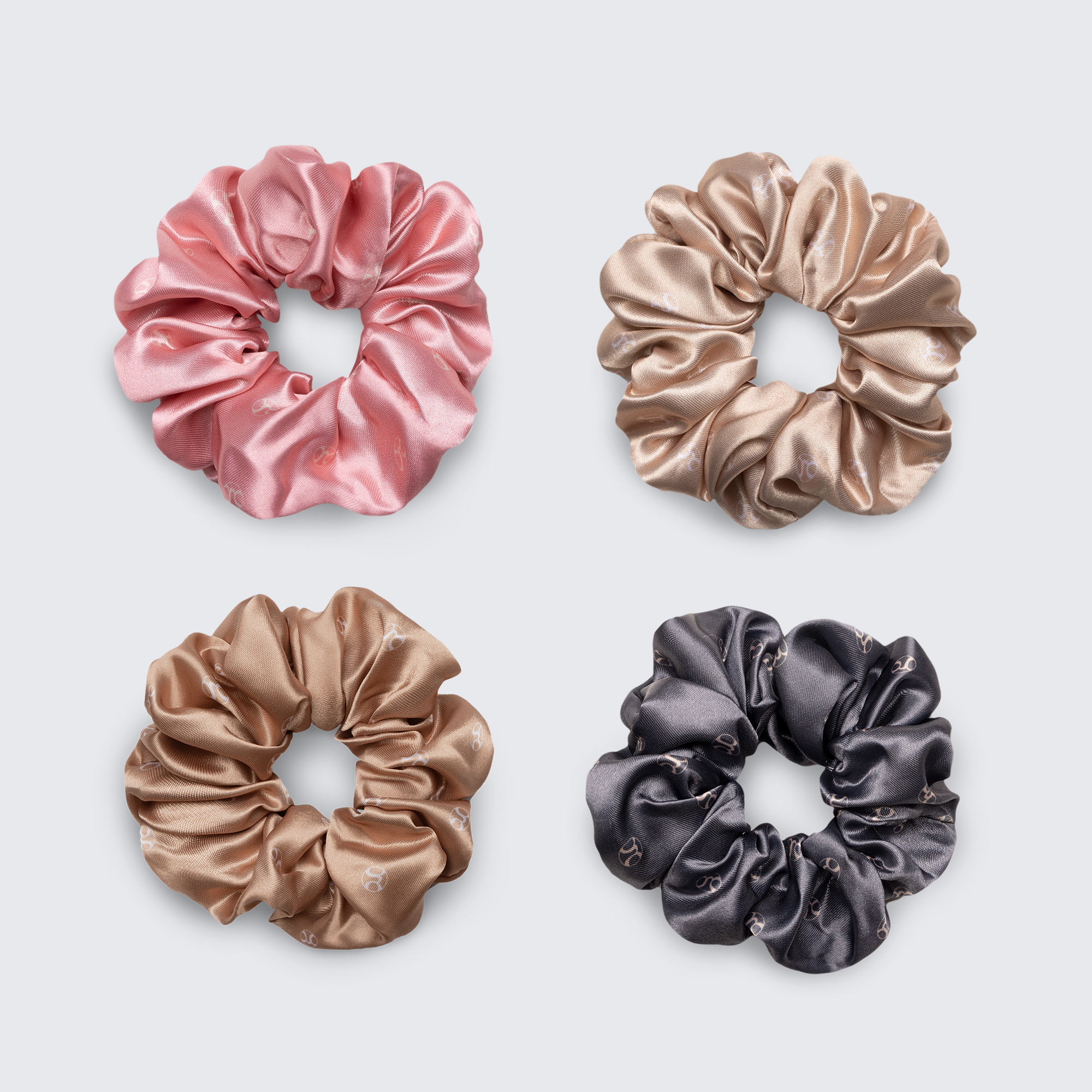 This assorted pack of 4 contains 1 charcoal, 1 pink, 1 rich cream, and 1 golden Satin Scrunchie.